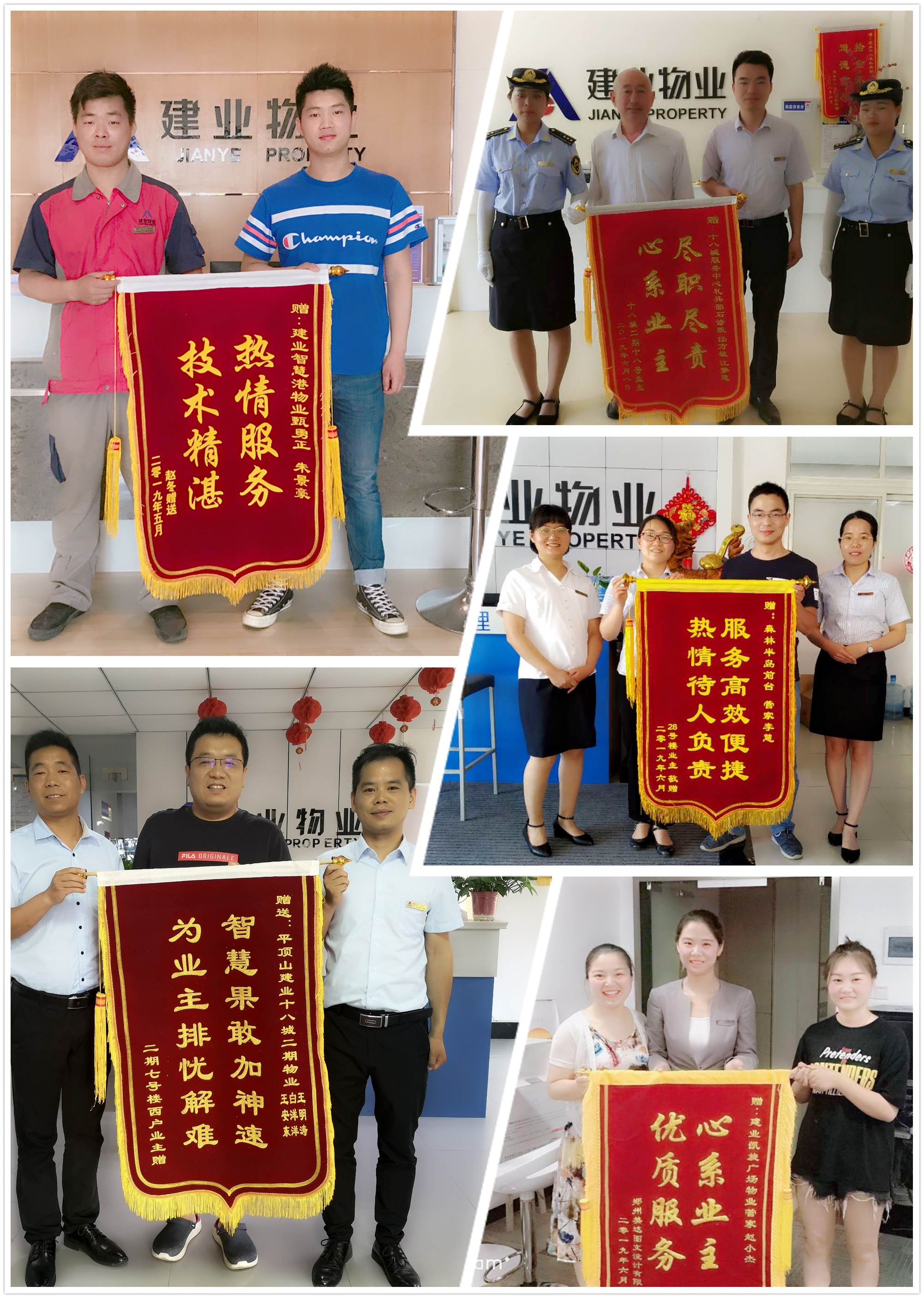 六月,艷陽如火,蟬鳴如潮。建業(yè)物業(yè)人滿懷如火的熱情,用服務(wù)為業(yè)主送來絲絲舒暢。六月份全省在管小區(qū)涌現(xiàn)出好人好事共計(jì)284例,其中收到錦旗65面,表?yè)P(yáng)信127封,來電感謝及其他92例。