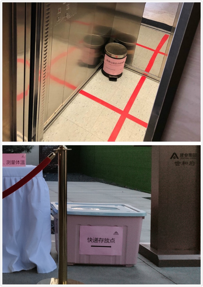 合理規(guī)劃分區(qū):電梯間張貼安全分區(qū)線,案場外圍設(shè)置快遞、外賣臨時存放處。所有物品存放前必須進(jìn)行消毒處理,確認(rèn)安全后通知員工自取。