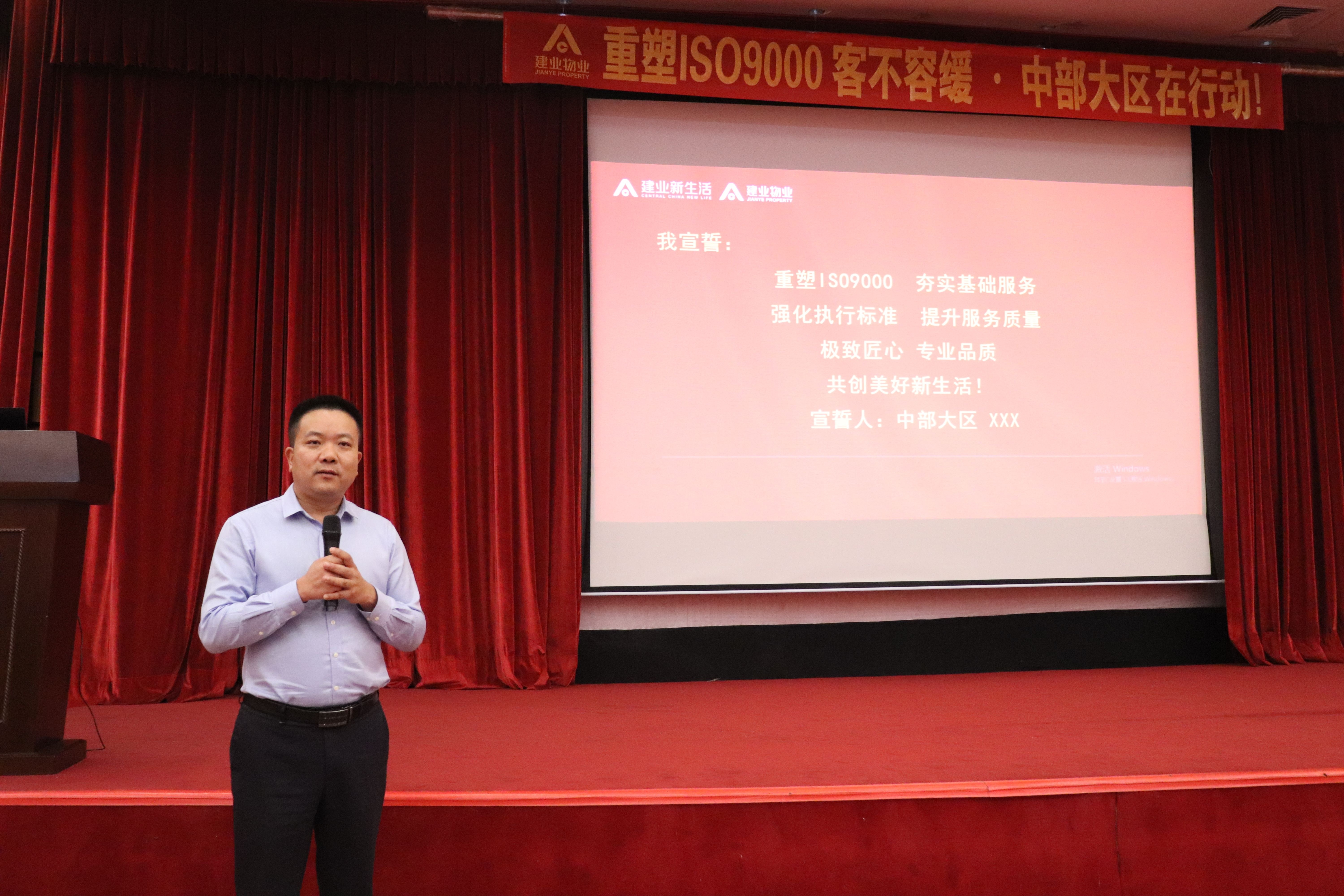 會議開始,建業(yè)物業(yè)中部大區(qū)副總經理陳沖圍繞八個方面對“重塑ISO9000 客不容緩”行動方案進行宣講。